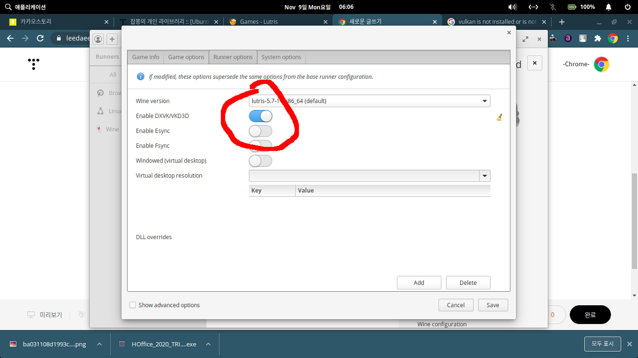 두 번째 사진과 같이 Runner options에서 Enable DXVK/VKD3D를 건드려 봅시다.